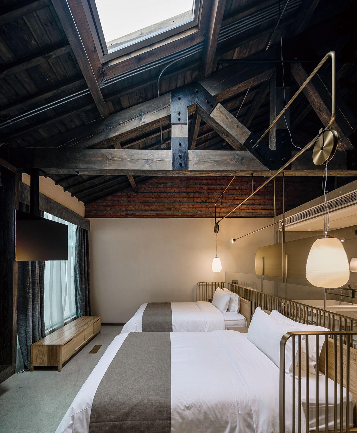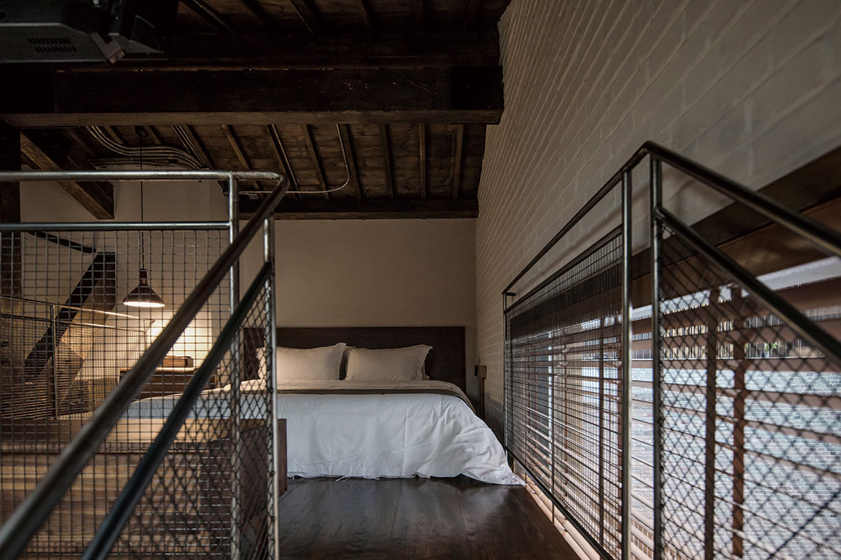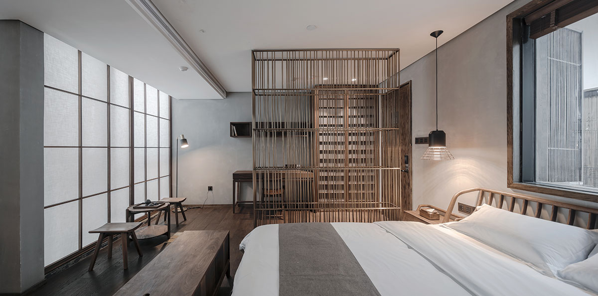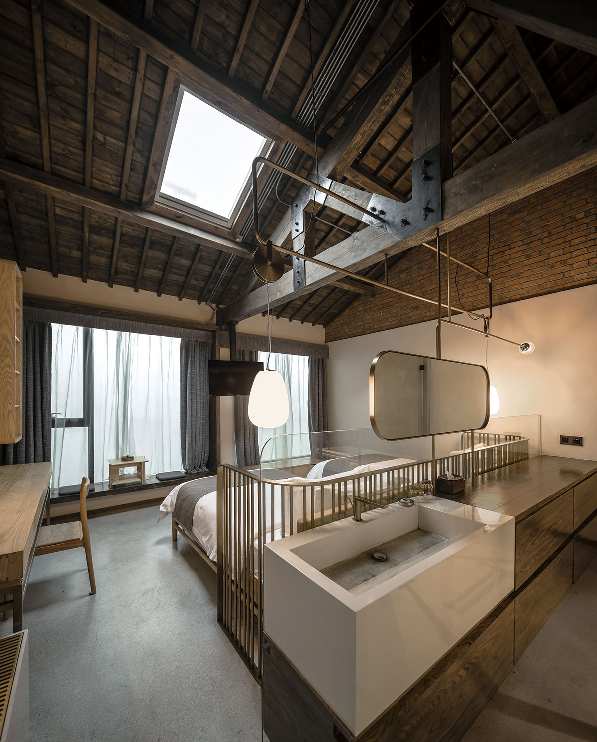 渝舍印象由兩棟樓組成,設計過程從整合的角度梳理了文化、自然、建筑之間的關系。以入口處以折疊巡回的青磚引入,為空間的公共與私密提供了過渡。參考北方的四合院和上海小院的特點,設計師大刀闊斧,在寸土寸金的上海市中心辟出一處院落,解決了建筑間的孤立狀態(tài),使客房、前廳大堂和咖啡廳視覺上遙相呼應,院落的引入集中體現(xiàn)了傳統(tǒng)建筑的造園思想。大片窗戶和鋼板組成干干凈凈的冷色基調(diào),與透出的暖黃光形成對比,正如渝舍印象的經(jīng)營模式:用酒店式的管理方法,民宿的人文情懷去經(jīng)營。這里有書籍、音樂、咖啡和茶,懶懶地坐在舒服的沙發(fā)上,發(fā)呆、看書、聊天,坐上一下午。